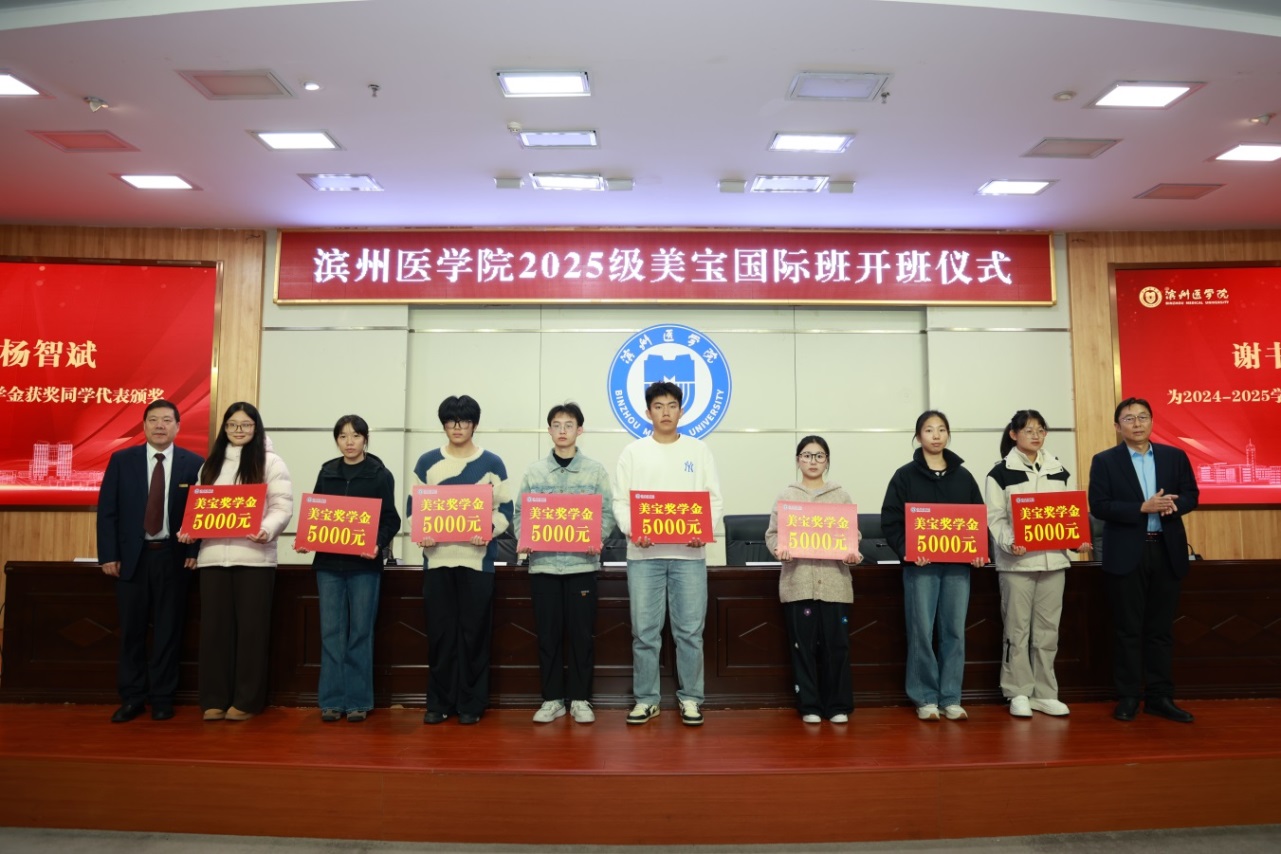 会见后,举行2025级美宝国际班开班仪式。谢书阳寄语2025级美宝班新生,要扎实掌握专业知识,积极培养创新思维,成就自己的人生理想。他强调,各教学职能部门及相关学院要高度重视美宝国际班的人才培养工作,持续深化产教融合的教育教学模式探索,助力美宝国际班本科教育实现持续创新发展。美宝集团(中国)副总裁商庆新介绍了美宝集团的发展历程和发展成效,并表示美宝集团将继续深化与滨医合作,为学生提供更多国内外学习机会,共同提升人才培养质量;并勉励同学们传承奋斗创新精神,争做卓越医学人才。8位美宝奖学金获奖同学代表接受颁奖,美宝奖学金获得者代表王涵、赴美访学学生代表孔浩然、新生代表龙永浩分别发言。美宝国际班学业导师徐飞博副教授发言并带领美宝班全体新生诵读医学生誓言。